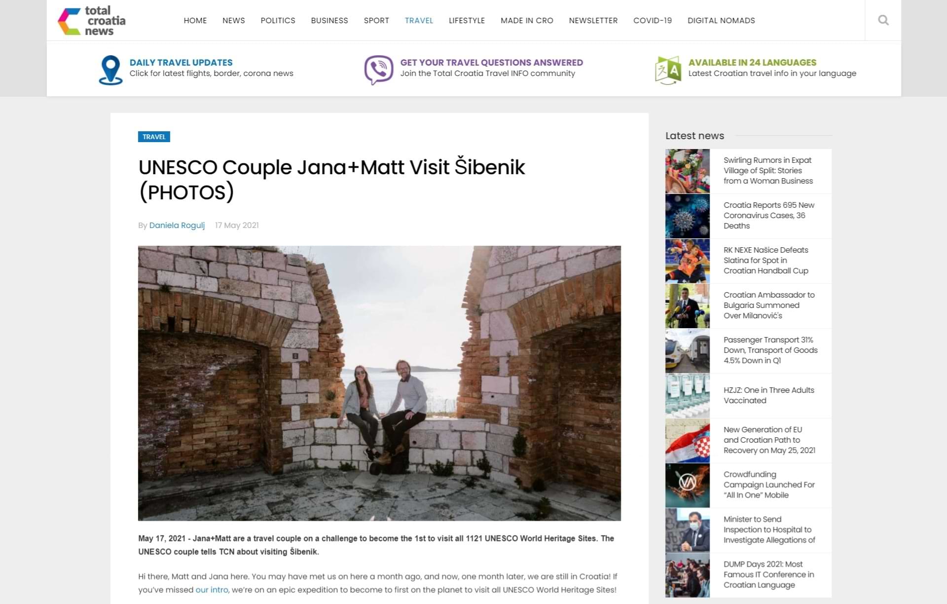 Total Croatia News published a couple of articles in English about our Epic Road Trip through Croatia. They called it "Meet Jana+Matt, On an Expedition to Become 1st to Visit All UNESCO World Heritage Sites".